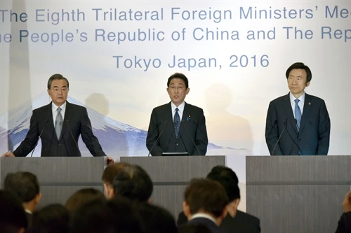 Ngoại trưởng Nhật Bản Fumio Kishida (giữa), Ngoại trưởng Trung Quốc Vương Nghị (trái) và Ngoại trưởng Hàn Quốc Yun Byung-se tại cuộc họp báo chung sau cuộc gặp ở Tokyo. AFP/TTXVN