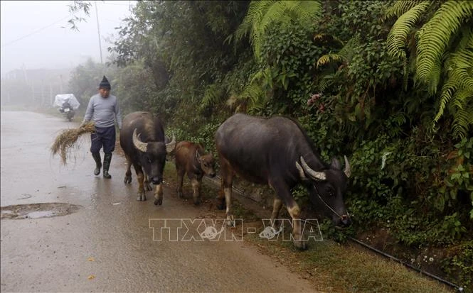 Người dân vùng cao thị xã Sa Pa chủ động di chuyển đàn trâu xuống vùng thấp chống rét. Ảnh: Quốc Khánh - TTXVN