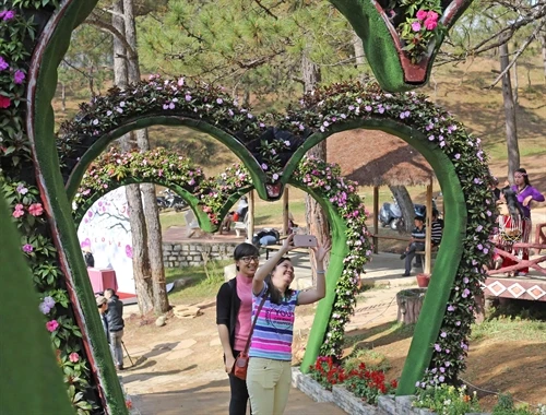 Du khách khám phá “Cung đường tình yêu” trong Khu du lịch Thung lũng Tình yêu (thành phố Đà Lạt, Lâm Đồng) nhân dịp Lễ Tình nhân 14/2. Ảnh: Nguyễn Dũng - TTXVN