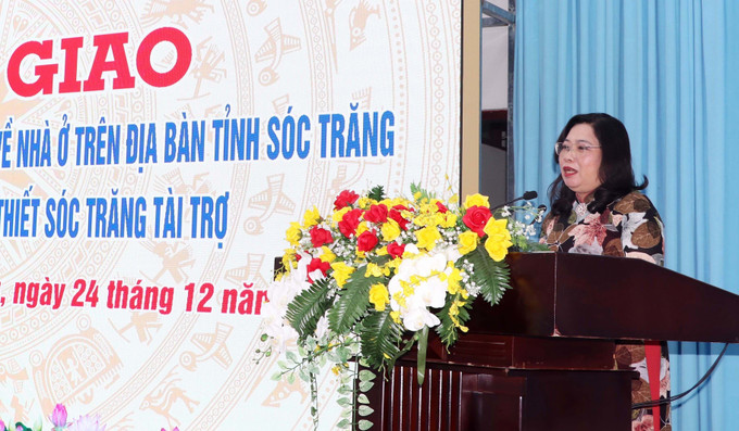 Phát biểu tại Lễ bàn giao nhà, bà Hồ Thị Cẩm Đào, Phó Bí thư Thường trực Tỉnh ủy, Chủ tịch HĐND tỉnh Sóc Trăng cho biết, hỗ trợ xây dựng nhà ở cho hộ nghèo, cận nghèo, hộ khó khăn về nhà ở là việc làm hết sức ý nghĩa, mang tính nhân văn sâu sắc, thể hiện tinh thần tương thân, tương ái, chung tay vì người nghèo của cả hệ thống chính trị và cộng đồng doanh nghiệp.