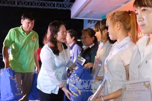 | Lãnh đạo Thành phố Hồ Chí Minh và các doanh nghiệp trao tặng quà và tấm vé nghĩa tình cho công nhân về quê đón Tết. Ảnh: Thanh Vũ - TTXVN |