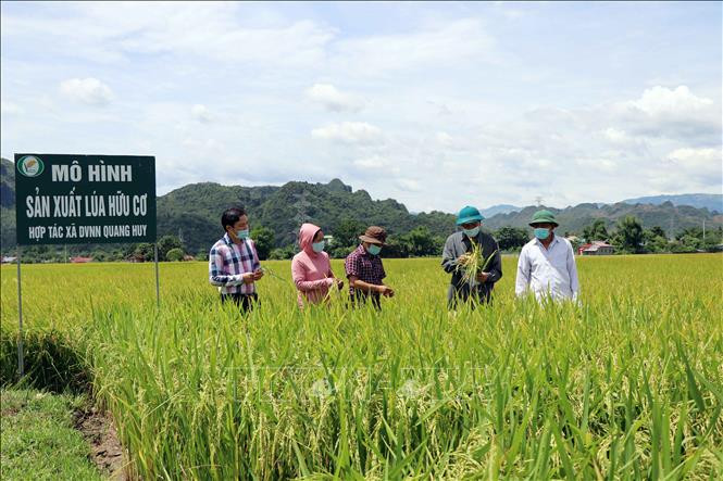 Cán bộ khuyến nông và người dân kiểm tra mô hình sản xuất lúa hữu cơ tại xã Quang Huy, huyện Phù Yên. Ảnh: Hữu Quyết – TTXVN