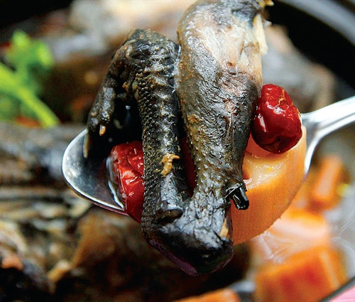 Khi thưởng thức, món gà đen vừa ngọt, giòn, vừa dai. Muốn ngon, bạn nên lấy thịt ra ăn khi vừa chín tới, như thế sẽ giữ được độ giòn ngọt của thịt gà. Món rau cải Mèo ngăm ngăm đắng cùng vị giòn của măng rừng, vị thơm ngọt của nấm hương và cùng vị cay cay của gia vị sẽ khiến cho thực khách thêm sảng khoái tâm hồn và cảm nhận được vị ngon của ẩm thực mùa thu.