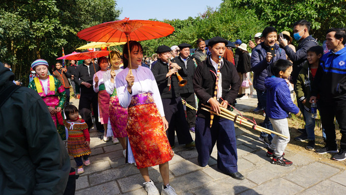 Đồng bào dân tộc Mông vui xuống chợ với điệu múa truyền thống. Ảnh: Hoàng Hải