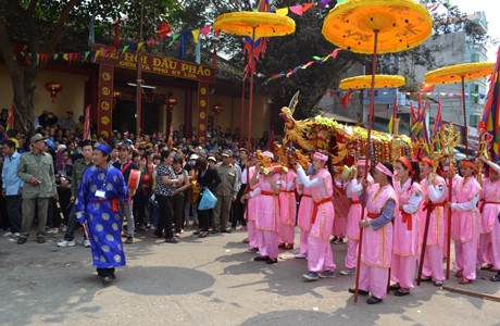 | Nghi lễ rước kiệu trong lễ hội đầu pháo Kỳ Lừa luôn thu hút người dự hội |