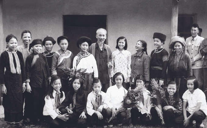 Bác Hồ chụp ảnh lưu niệm với đại biểu thiếu nhi và phụ nữ các dân tộc tỉnh Lào Cai ngày 23/9/1958. Ảnh: Tư liệu TTXVN