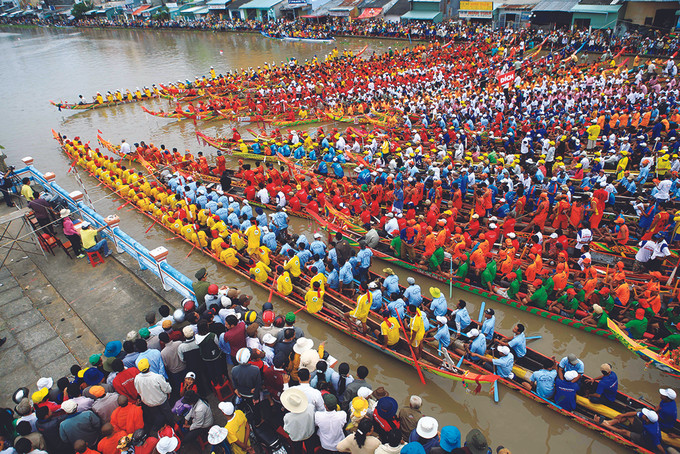 Vào dịp Rằm tháng 10 âm lịch hằng năm, đồng bào dân tộc Khmer ở Đồng bằng sông Cửu Long lại rộn ràng chuẩn bị Lễ cúng trăng (Oóc Om Bóc). Một nội dung không thể thiếu trong dịp lễ đó là đua ghe Ngo. Đua ghe Ngo thể hiện nét đẹp sinh hoạt văn hóa cộng đồng của người Khmer Nam Bộ, đồng thời là bộ môn thể thao dân tộc sôi nổi và hấp dẫn. Ảnh: Duy Khương