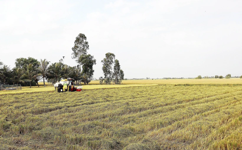 Nông dân xã Phú Tâm, huyện Châu Thành, tỉnh Sóc Trăng đang thu hoạch lúa. Ảnh: Tuấn Phi - TTXVN