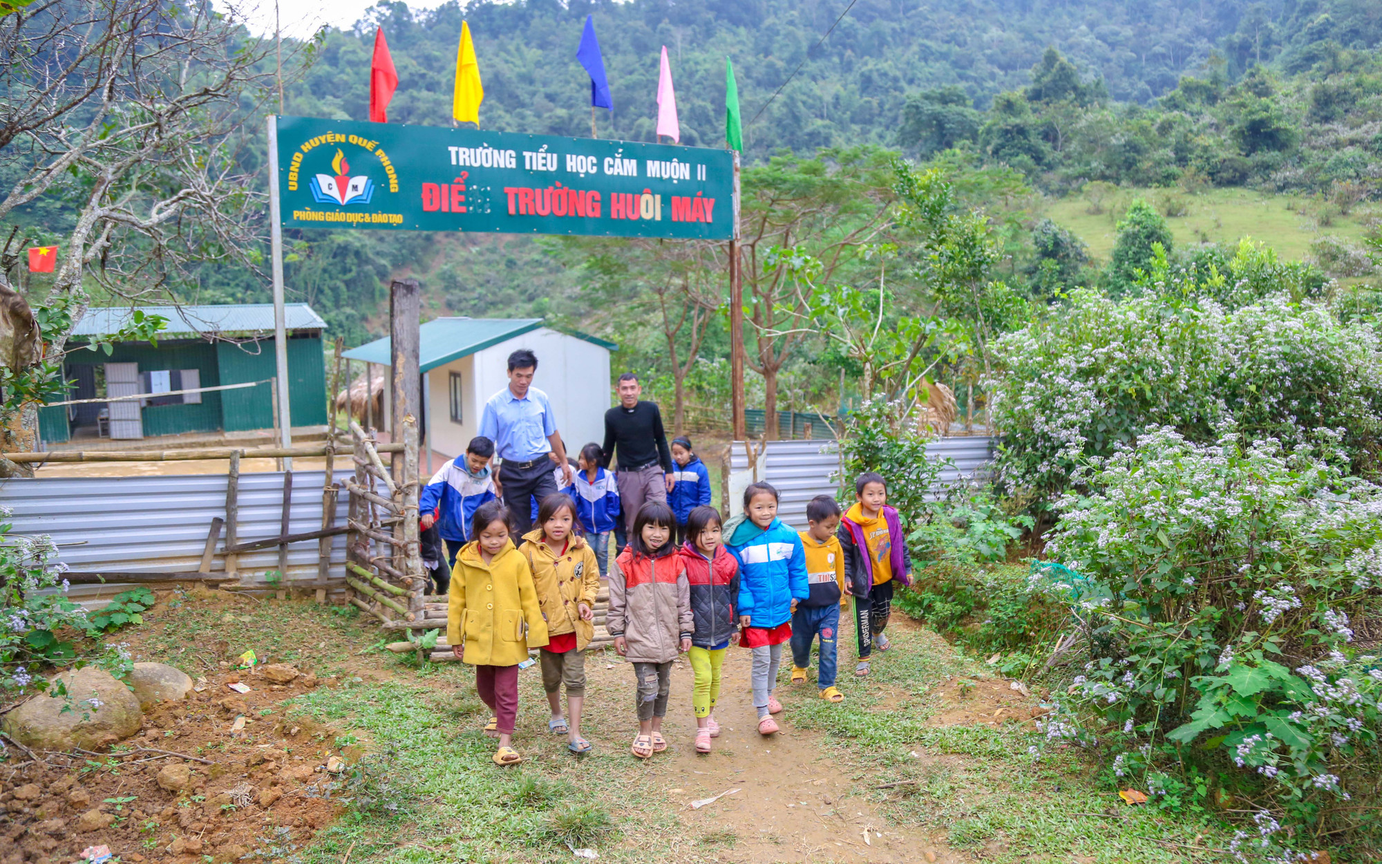 Điểm trường Huồi Máy thuộc trường Tiểu học 2 xã Cắm Muộn, huyện Quế Phong, Nghệ An lọt thỏm giữa bốn bền núi non và chưa có sóng điện thoại.