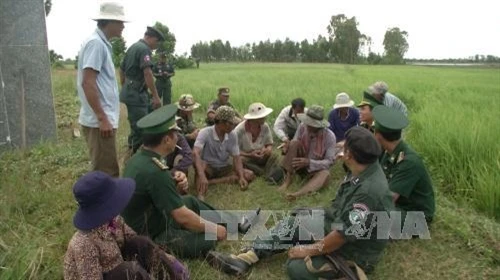 Lực lượng vũ trang và bà con hai bên biên giới gặp gỡ, thăm hỏi nhau dưới chân cột mốc 303 huyện Giang Thành và tỉnh Kam Pốt. Ảnh: Lê Sen/TTXVN |