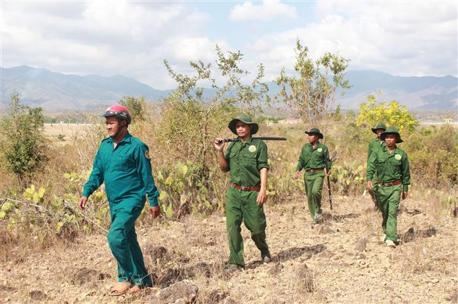 Cán bộ Trạm Bảo vệ rừng xã Phước Vinh (Ninh Phước, Ninh Thuận) cùng lực lượng tổ cộng đồng tuần tra, kiểm tra rừng tại địa phương. Ảnh: Công Thử - TTXVN