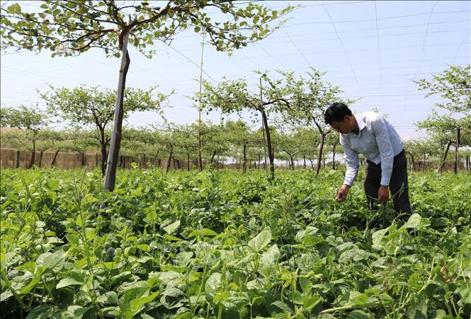 Mô hình ứng dụng trồng cây họ đậu để tạo thành “lớp phủ sống” giúp giữ ẩm, cải tạo đất cho vườn táo tại Viện Nghiên cứu Bông và Phát triển nông nghiệp Nha Hố (huyện Ninh Sơn, Ninh Thuận). Ảnh: Nguyễn Thành – TTXVN