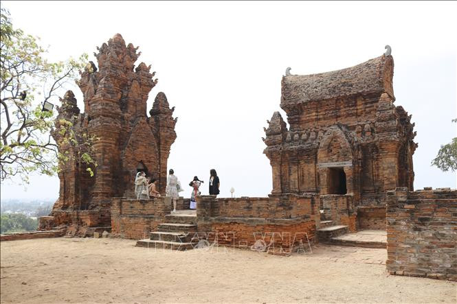 Du khách chụp hình lưu niệm tại Di tích triến trúc nghệ thuật Quốc gia đặc biệt tháp Po Klong Garai (phường Đô Vinh, thành phố Phan Rang – Tháp Chàm). Ảnh: Nguyễn Thành – TTXVN