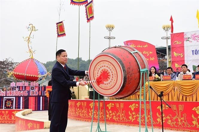 Lãnh đạo huyện Chiêm Hóa, tỉnh Tuyên Quang đánh trống khai hội. Ảnh: Quang Cường -TTXVN