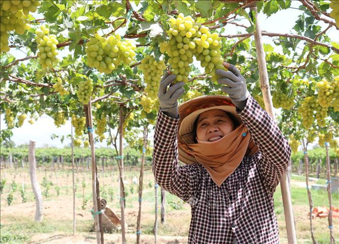 Nông dân xã Phước Thuận, huyện Ninh Phước trồng giống nho xanh NH 01 – 48 theo chuẩn VietGAP, đạt hiệu quả kinh tế cao. Ảnh: Nguyễn Thành – TTXVN