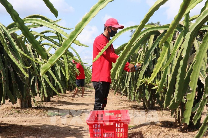 Chăm sóc thanh long tại nhà vườn ở huyện Chợ Gạo (Tiền Giang). Ảnh: TTXVN