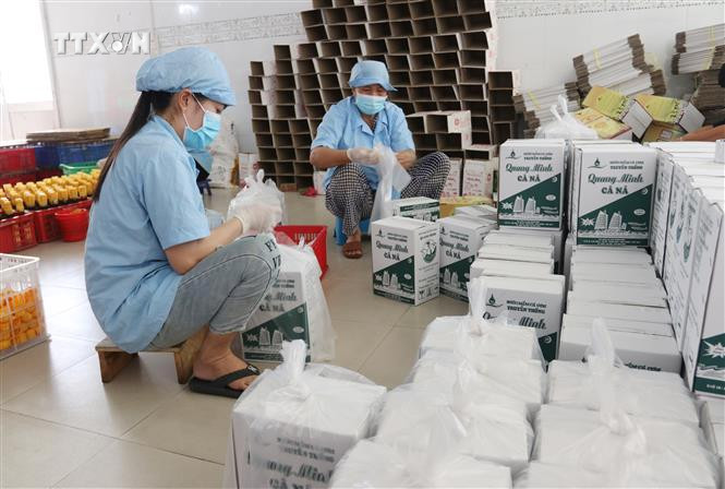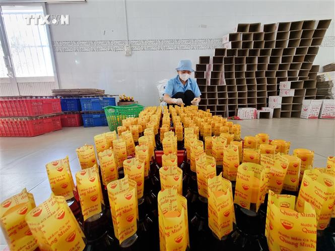 Công đoạn đóng nước mắm vào chai tại Cơ sở sản xuất nước mắm Quang Minh (xã Cà Ná, huyện Thuận Nam). Ảnh: Nguyễn Thành - TTXVN