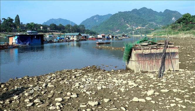 Nước sông Lô cạn gây ảnh hưởng đến các hộ nuôi cá lồng. Ảnh: Vũ Quang - TTXVN