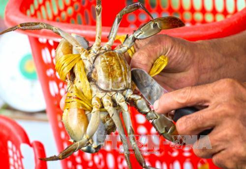 Các thương lái kiểm tra độ chắc của gạch cua. Ảnh: Huỳnh Thế Anh - TTXVN