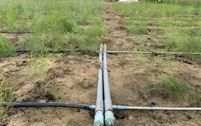 Hệ thống tưới nước phun mưa cho măng tây xanh được ông Hùng Ky đầu tư lắp đặt. Ảnh: Công Thử - TTXVN