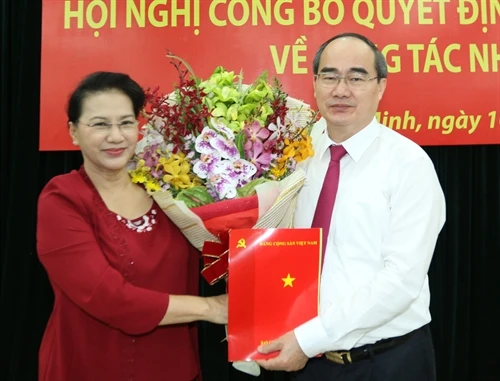 | Ủy viên Bộ Chính trị, Chủ tịch Quốc hội Nguyễn Thị Kim Ngân trao Quyết định của Bộ Chính trị phân công đồng chí Nguyễn Thiện Nhân, Ủy viên Bộ Chính trị, Chủ tịch Ủy ban Trung ương Mặt trận Tổ quốc Việt Nam tham gia Đảng bộ Thành phố Hồ Chí Minh, giữ chức vụ Bí thư Thành ủy Thành phố Hồ Chí Minh. Ảnh: Thanh Vũ - TTXVN |