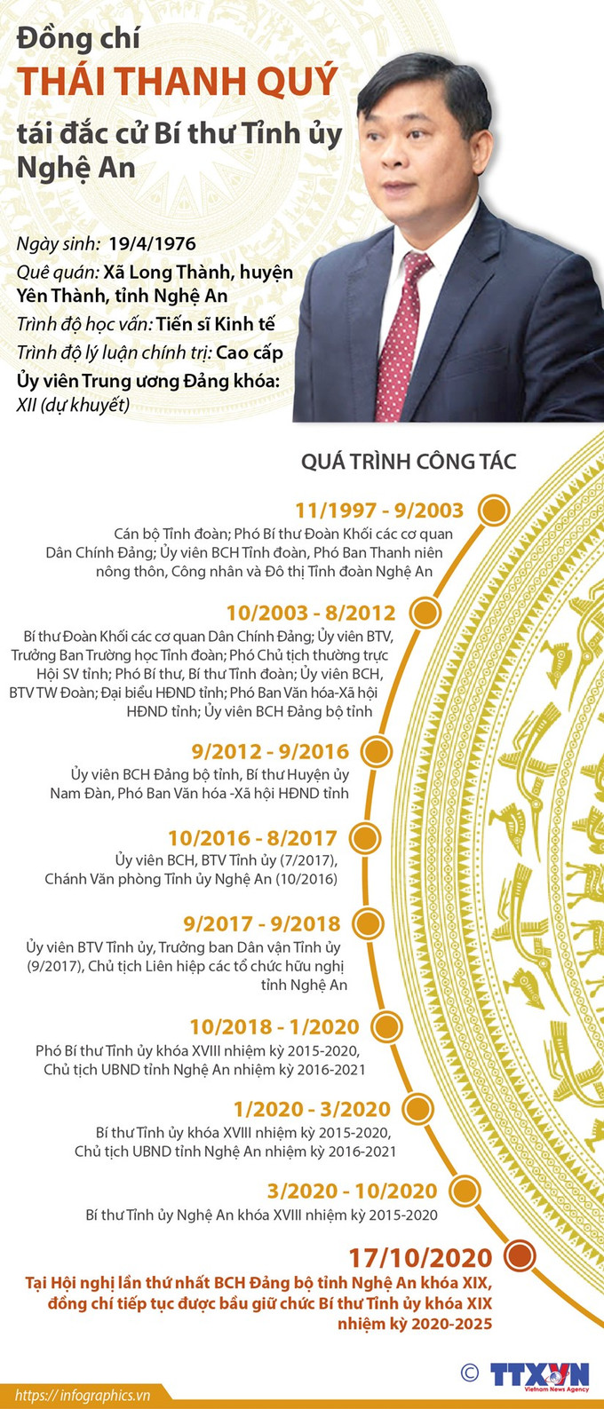 Đồng chí Thái Thanh Quý, sinh ngày 19/4/1976; dân tộc Kinh; quê quán xã Long Thành, huyện Yên Thành, tỉnh Nghệ An; trình độ chuyên môn: Tiến sỹ Kinh tế; Lý luận chính trị: Cao cấp.