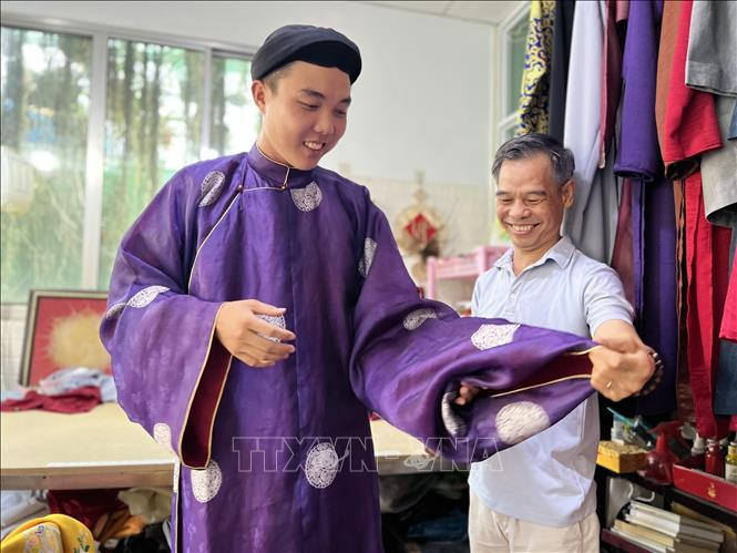 Ông Trần Thanh Tòng đang hoàn thiện chiếc áo dài cổ phục. Ảnh: Ánh Tuyết - TTXVN