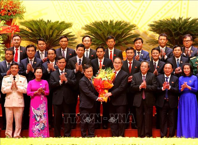 Đồng chí Nguyễn Thiện Nhân tặng hoa Ban Chấp hành Đảng bộ tỉnh Quảng Bình nhiệm kỳ 2020 - 2025. Ảnh: Văn Tý-TTXVN