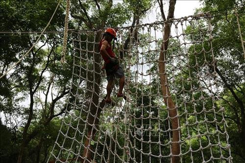 | Thử sức với trò chơi trên cây. Ảnh: Mạnh Thành-TTXVN |