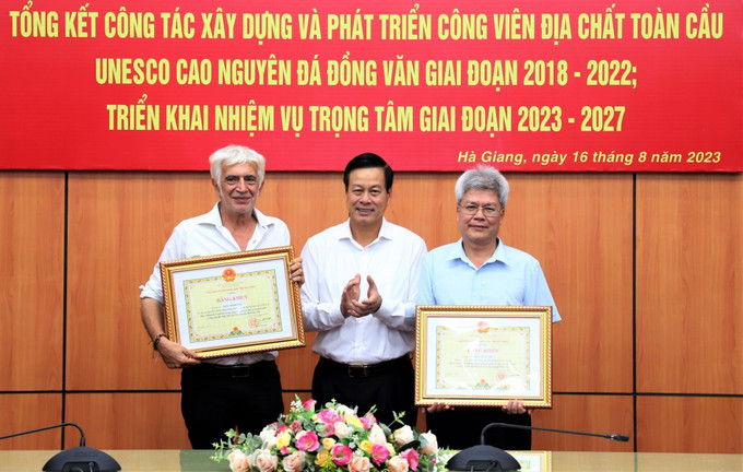 Chủ tịch UBND tỉnh Hà Giang Nguyễn Văn Sơn trao tặng Bằng khen cho Giáo sư Guy Martini, cố vấn cao cấp, Chủ tịch Hội đồng, Tổng Thư ký mạng lưới Công viên Địa chất toàn cầu UNESCO và PGS.TS Trần Tân Văn, điều phối viên mạng lưới Công viên Địa chất toàn cầu. Ảnh: Minh Tâm-TTXVN