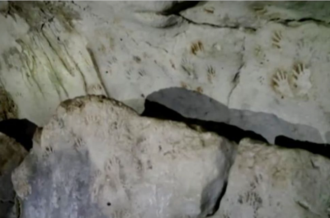 Các dấu tay in trên vách hang động. Ảnh: Reuters