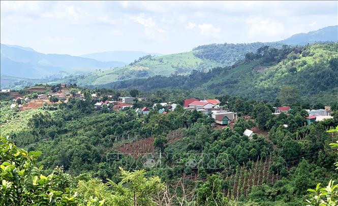 Làng PYầu, xã Lơ Pang, huyện Mang Yang (tỉnh Gia Lai) tựa như một “ốc đảo”, bao quanh là màu xanh bạt ngàn của rừng. Ảnh: Quang Thái- TTXVN