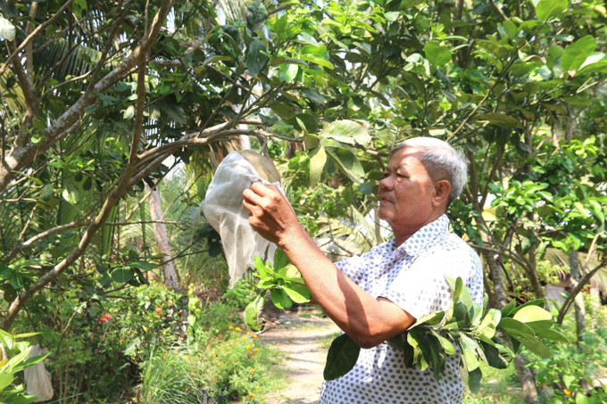 Ông Kim Ruône, Bí thư chi bộ ấp Bót Chếch, xã Lương Hòa, huyện Châu Thành là người có uy tín vùng đồng bào dân tộc Khmer chăm sóc vườn cây ăn trái của gia đình. Ảnh: Thanh Hòa - TTXVN