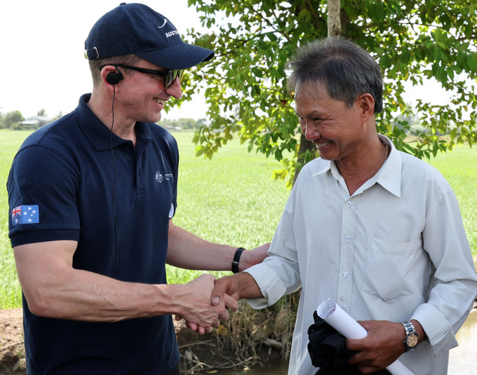Nông dân Nguyễn Văn Một (ấp Tân An, xã Bình Thạnh Trung, huyện Lấp Vò, tỉnh Đồng Tháp), một nông dân thế hệ 4.0 điển hình và ông Mark Tattersall, Phó Đại sứ Australia tại Việt Nam trên cánh đồng lúa ông đang canh tác. Ảnh: Trọng Chính