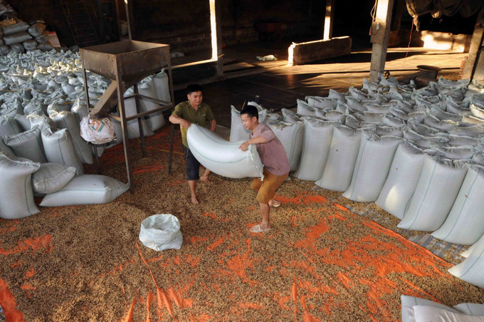 Đóng bao cà phê tại xưởng sản xuất ở xã Chiềng Pha (Thuận Châu, Sơn La). Ảnh: Quang Quyết - TTXVN