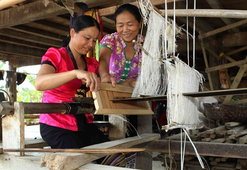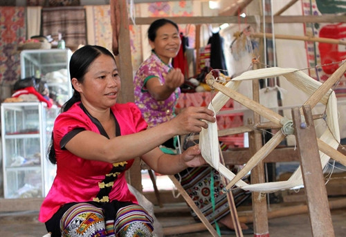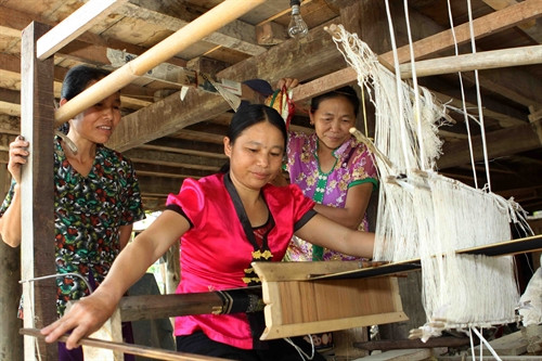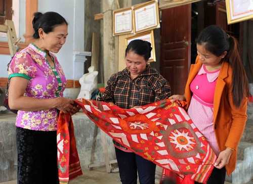| Chị em đồng bào dân tộc Thái ở làng nghề dệt thổ cấm Châu Tiến, Quỳ Châu (Nghệ An) cùng nhau chia sẻ kinh nghiệm làm các sản phẩm thổ cẩm. |