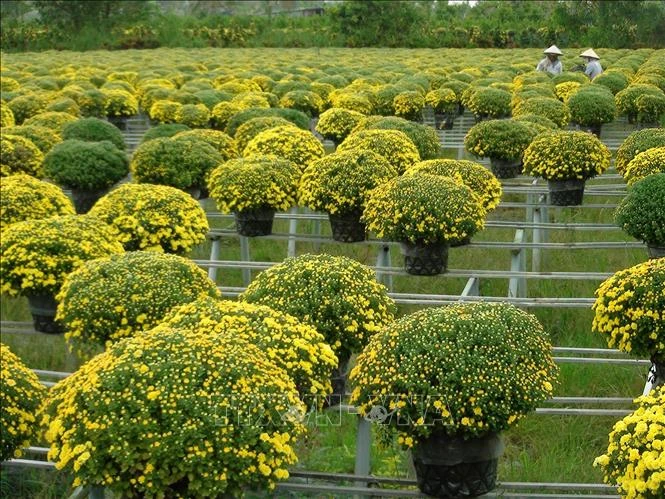 Cúc mâm xôi ở Làng hoa Sa Đéc phục vụ Tết. Ảnh: Nguyễn Văn Trí - TTXVN