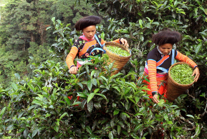 Thu hái chè Shan tuyết cổ thụ tại bản Bẹ, xã Tà Xùa, huyện Bắc Yên (Sơn La). Ảnh: Quang Quyết-TTXVN