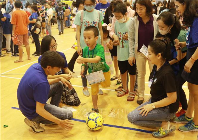 Các chuyên viên can thiệp hướng dẫn trẻ tự kỷ chơi bóng đá. Ảnh: Đinh Hằng - TTXVN
