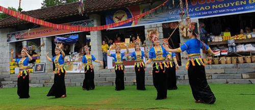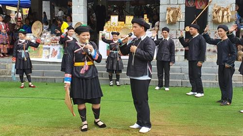 | Biểu diễn những điệu múa, những bài hát truyền thống của dân tộc mình tại phiên chợ. Ảnh: Hoàng Hải |