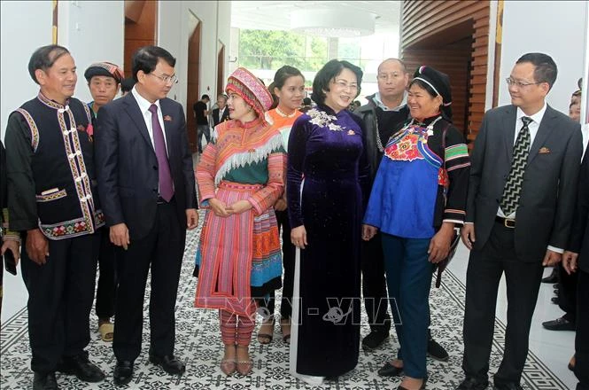 Phó Chủ tịch nước Đặng Thị Ngọc Thịnh, Phó Chủ tịch thứ nhất Hội đồng Thi đua-Khen thưởng Trung ương với đồng bào các dân tộc tỉnh Lào Cai tại Đại hội. Ảnh: Quốc Khánh - TTXVN