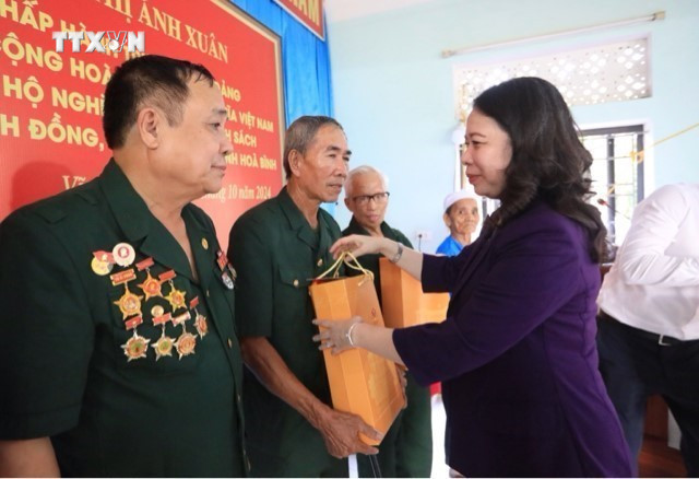 * Cùng ngày, Phó Chủ tịch nước Võ Thị Ánh Xuân đã tặng 42 suất quà cho hộ nghèo và gia đình chính sách, người có uy tín tại xóm Sống, xã Vĩnh Đồng, huyện Kim Bôi.