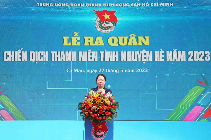 Phó chủ tịch nước Võ Thị Ánh Xuân phát biểu chỉ đạo tại Lễ ra quân chiến dịch Thanh niên tình nguyện hè 2023. Ảnh: Huỳnh Anh - TTXVN