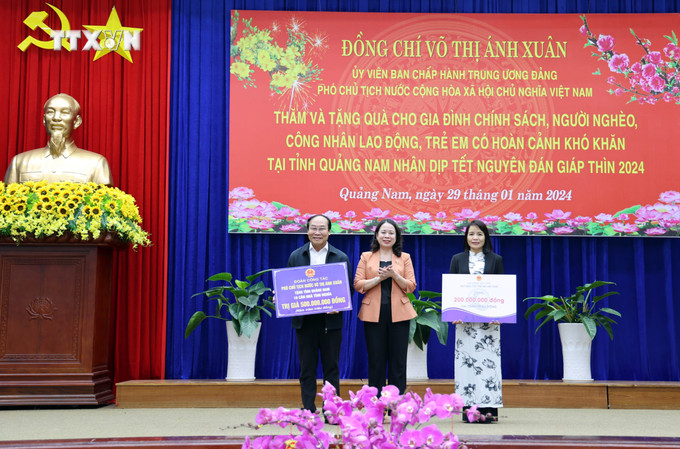 Ngày 29/1, Phó Chủ tịch nước Võ Thị Ánh Xuân và Đoàn công tác đến thăm, tặng quà cho các gia đình chính sách có hoàn cảnh khó khăn, hộ nghèo, cận nghèo, công nhân lao động, trẻ em có hoàn cảnh khó khăn trên địa bàn tỉnh Quảng Nam nhân dịp Tết Nguyên đán Giáp Thìn năm 2024.