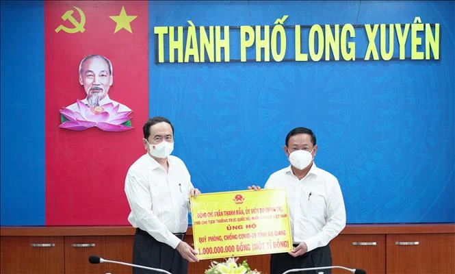 Ủy viên Bộ Chính trị, Phó Chủ tịch Thường trực Quốc hội Trần Thanh Mẫn trao biểu trưng 1 tỷ đồng hỗ trợ công tác phòng, chống dịch COVID-19 cho tỉnh An Giang. Ảnh: Công Mạo-TTXVN