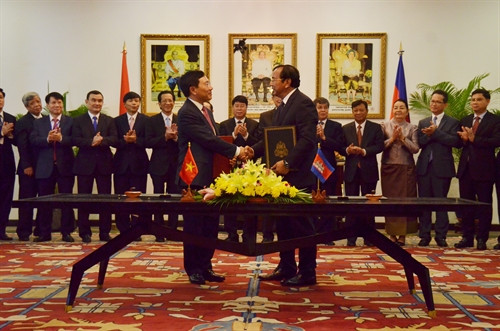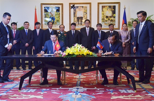 Hai bên khẳng định quyết tâm sớm hoàn thành công tác phân giới cắm mốc biên giới trên bộ nhằm xây dựng đường biên giới hòa bình, ổn định, hợp tác cùng phát triển; nhất trí tiếp tục hợp tác chặt chẽ trong công tác tìm kiếm, cất bốc và hồi hương hài cốt liệt sỹ quân tình nguyện Việt Nam hy sinh trong thời kỳ chiến tranh ở Campuchia; khẳng định lại nguyên tắc không cho phép bất kỳ lực lượng thù địch nào sử dụng lãnh thổ nước này để tiến hành các hoạt động chống phá an ninh nước kia. Hai bên cũng nhất trí thực hiện việc đảm bảo các quyền chính đáng của kiều dân hai nước được làm ăn, sinh sống bình thường như các kiều dân khác tại mỗi nước.