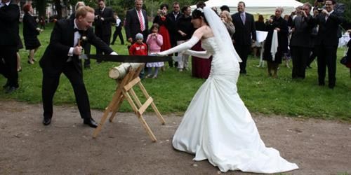 Ở một số vùng, người thân còn thử thách cô dâu & chú rể bằng cách bắt họ cùng cưa một khúc gỗ. Mỗi người phải đứng một đầu cầm cưa và đẩy đưa sao cho thật nhịp nhàng, uyển chuyển, không bị vấp, không nhanh, không chậm – đây là biểu tượng cho một cuộc hôn nhân hài hòa, nhịp nhàng, biết nhường nhịn lẫn nhau để đạt hạnh phúc.