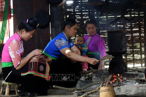 | Những lúc rảnh rỗi, phụ nữ Thái thường hay thêu thùa họa tiết hoa văn để may trang phục. Ảnh: Phan Tuấn Anh - TTXVN |
