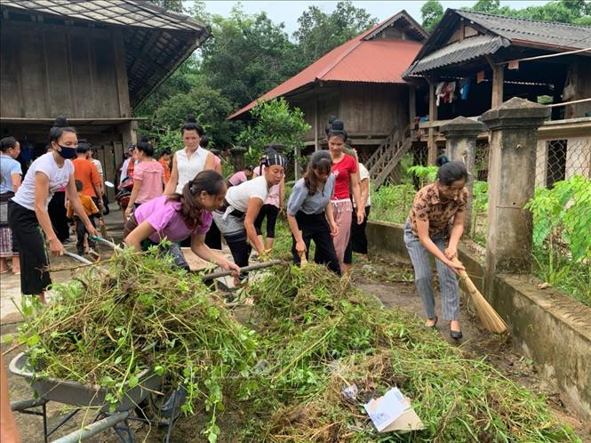 Phụ nữ bản Gia Khâu 1, xã Sùng Phài, thành phố Lai Châu, quét dọn đường làng, ngõ xóm. Ảnh: Việt Hoàng - TTXVN