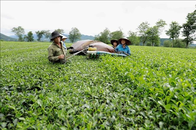 Thu hoạch chè bằng máy để đưa về nhà máy chế biến tại nông trường chè của Công ty chè Phú Đa. Ảnh: Vũ Sinh - TTXVN